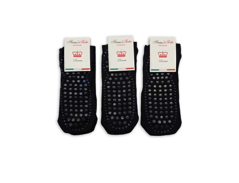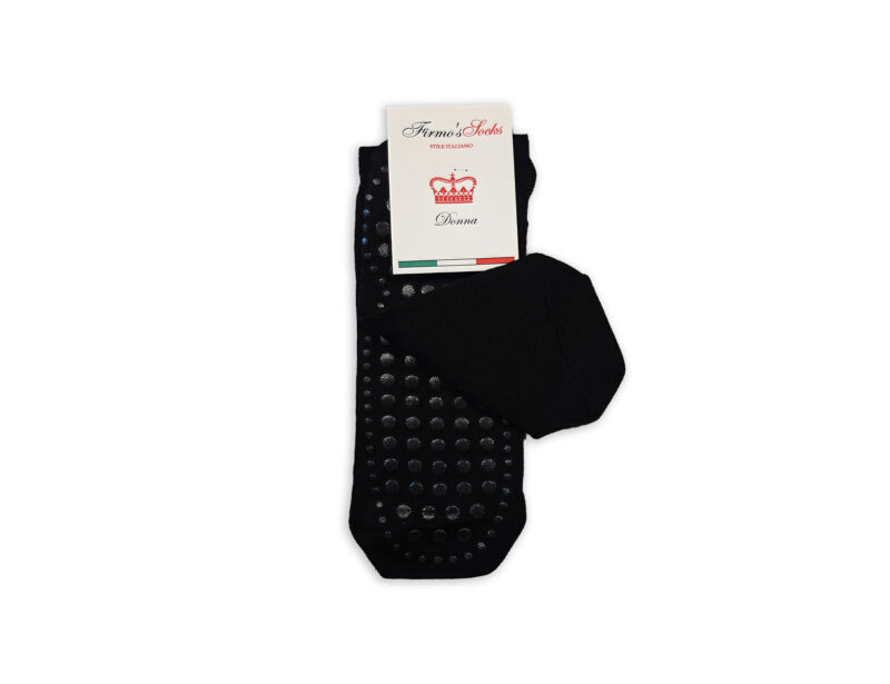 Calza per donna antiscivolo. Realizzata in morbido cotone elasticizzato. Trattamento antiscivolo sotto il piede. Lavaggio a 30°, consigliabile non usare l'asciugatrice. 95% cotone, 3% elastan 2% polyamide