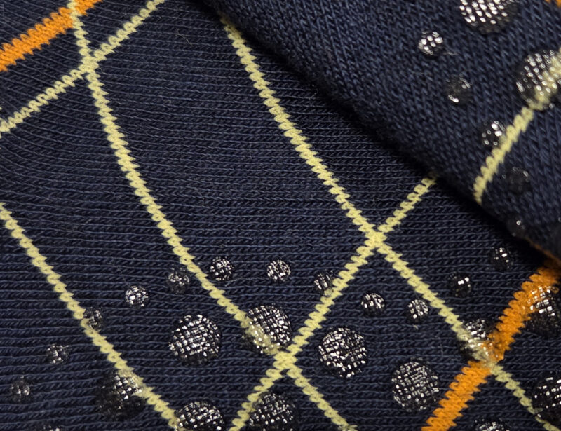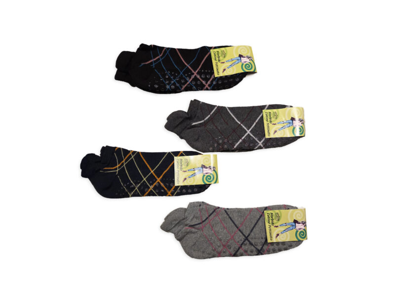 Calza per donna antiscivolo, ideale per attività sportiva. Realizzata in caldo cotone con morbido interno in spugna. Punta e tallone rinforzati. Trattamento antiscivolo sotto il piede. Lavaggio a 30°, consigliabile non usare l'asciugatrice. ATTENZIONE: Ogni confezione contiene 4 paia di calze, con assortimento come in immagine.