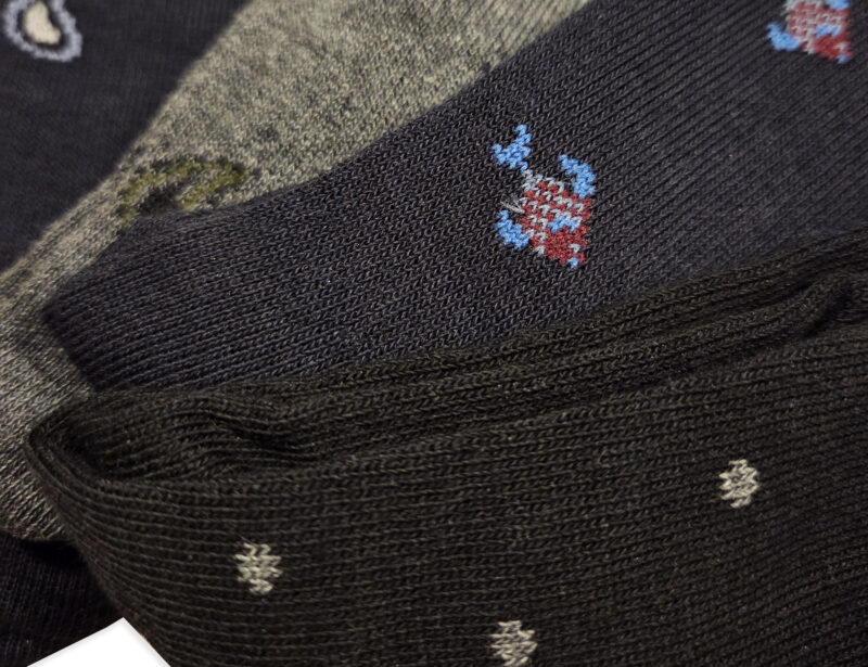 Calza da uomo elasticizzata in morbido cotone con fantasia e cucitura piatta. Ogni confezione contiene 4 paia di calze con assortimento come in foto. Altezza gamba 23 cm, circa metà polpaccio. Lavaggio a 40°, consigliabile non usare l'asciugatrice. Prodotte interamente da noi. (I colori possono variare a seconda della disponibilità in negozio e sono in continuo aggiornamento).