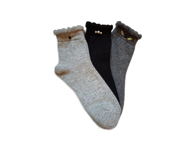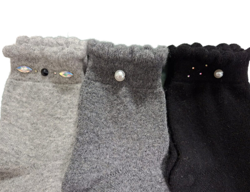 Calza corte per donna in cashmere, con applicazione di strass sull'elastico. Calda e soffice. 30% cashmere, 30% lana merinos, 20% viscosa, 15% acrilico, 5% lycra.