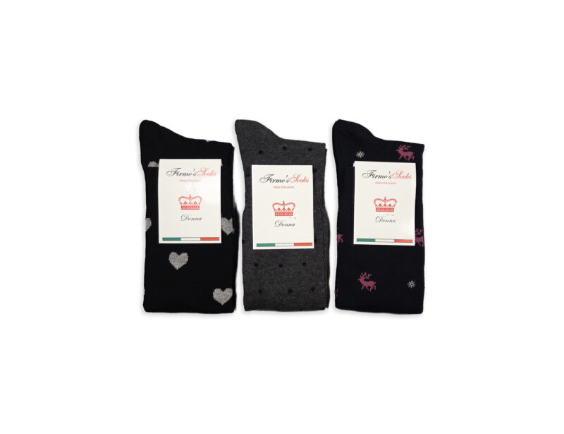 Calza lunga per donna in cotone con fantasia.  Lavaggio a 40°, consigliabile non usare l'asciugatrice. Prodotte interamente da noi. 95% cotone, 3% elastan, 2% polyamide. ATTENZIONE: Ogni confezione contiene 3 paia di calze, con assortimento come in immagine. Taglia unica per donna 35-40.